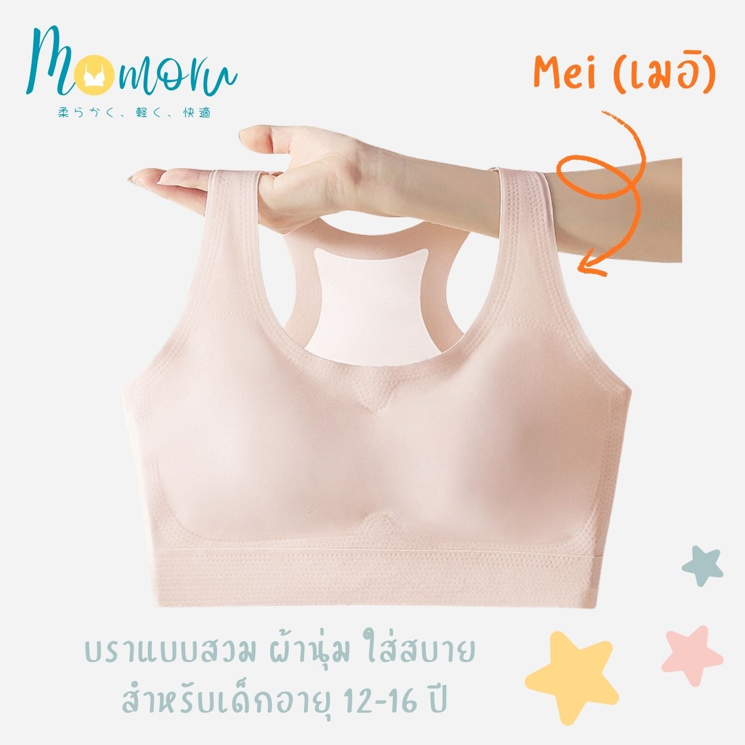 เริ่มต้นวัยสาวอย่างมั่นใจ ด้วย Momoru รุ่น Mei (เมอิ) เสื้อในเด็กแบบสวมที่ออกแบบมาเพื่อความสบายอย่างแท้จริง 💖 เหมาะสำหรับเด็กผู้หญิงอายุ 12-16 ปี ที่กำลังมองหา "เฟิร์สบรา" (First Bra) หรือสปอร์ตบราที่รองรับกิจกรรมในชีวิตประจำวัน ไม่ว่าจะไปโรงเรียน เรียนพละ หรือทำกิจกรรมแอคทีฟ