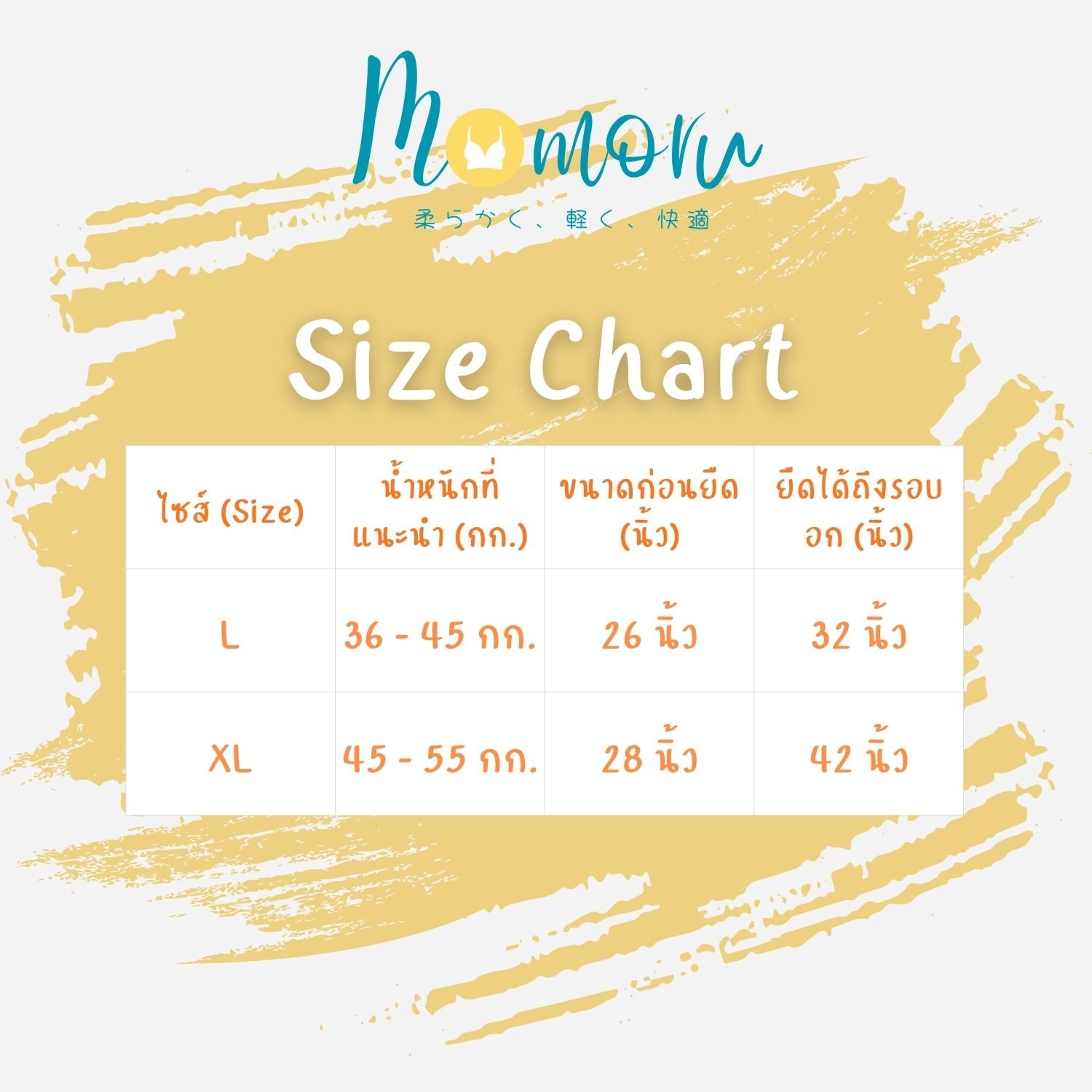 | ไซส์ (Size) | น้ำหนักที่แนะนำ (กก.) | ขนาดก่อนยืด (นิ้ว) | ยืดได้ถึงรอบอก (นิ้ว) |